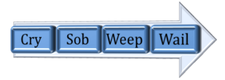 - Example: "Sob indicates more emotion than cry, but weep is a more outward expression of that emotion. Wail is the most intense of the words because it suggests the person is inconsolable and cannot help but express his pain loudly."