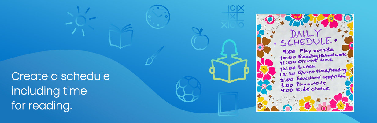 Include the whole family in creating a daily or weekly schedule. It doesn’t need to be a detailed, color-coded, illustrated masterpiece—just try to map out a predictable routine that includes time for reading.