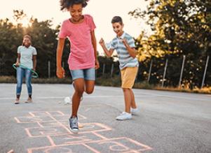 Write letters on the ground with chalk or masking tape, and children can jump to each letter as you say it. Bonus points for naming a word beginning with that letter.