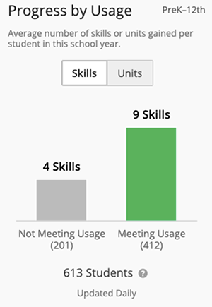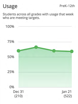 For Lexia® products like Core5 and PowerUp, fidelity means consistently ensuring students meet their individualized usage targets. Students receive usage targets each month based on their performance. To be considered as having met fidelity, students should log at least 20 weeks of use in Core5 and PowerUp and meet their usage targets at least 50% of those weeks.