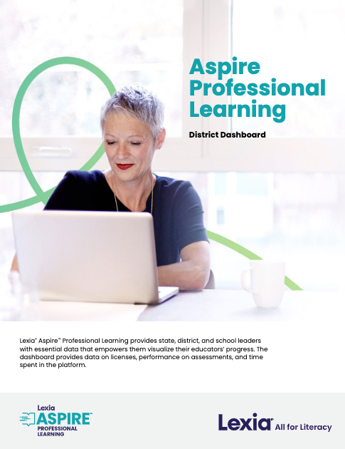 Lexia Aspire Professional Learning provides state, district, and school leaders with essential data that empowers them to visualize their educators' progress. The dashboard provides data on licenses, performance on assessments, and time spent in the platform.