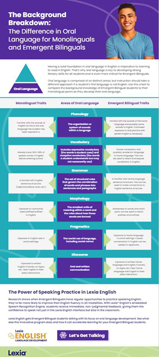 Oral language is the cornerstone of literacy for Emergent Bilingual students. Research shows that opportunities for speaking practice in the classroom lead to better literacy outcomes long term. Understanding the foundational oral language differences monolingual and Emergent Bilingual students bring to the classroom allows teachers to better differentiate instruction for literacy success.