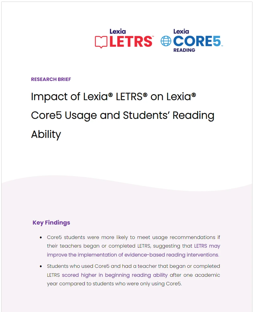 Key Findings: Core5 students were more likely to meet usage recommendations if their teachers began or completed LETRS, suggesting that LETRS may improve the implementation of evidence-based reading interventions. Students who used Core5 and had a teacher who began or completed LETRS scored higher in beginning reading ability after one academic year compared to students who were only using Core5.