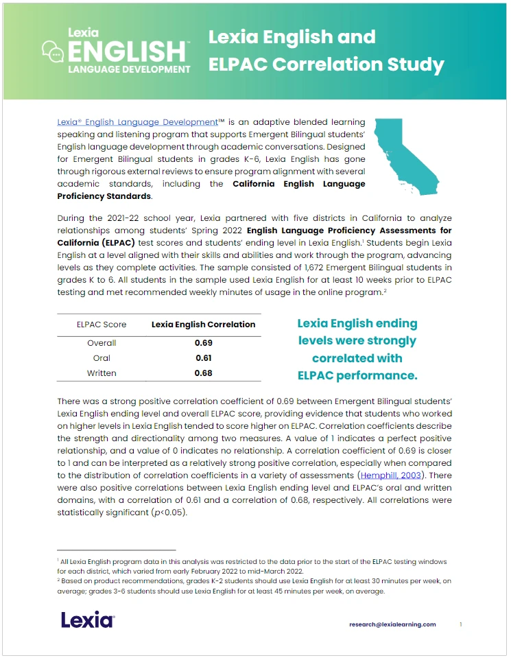 Lexia® English Language Development® performance measures were shown to be valid indicators of English language proficiency based on comparisons with scores on the English Language Proficiency Assessments for California (ELPAC) test. There was a strong positive correlation between Emergent Bilingual students’ Lexia English ending level and overall ELPAC score, providing evidence that students who worked on higher levels in Lexia English scored higher on the ELPAC.