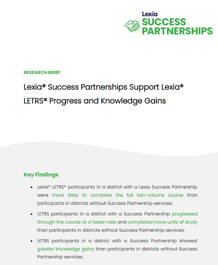 PURPOSE: Lexia's Success Partnerships are designed to support customers in achieving implementation success. Each Success Partnership includes a dedicated Customer Success Manager (CSM) who partners with and supports school leadership teams in planning and monitoring program implementation. This study examined the impact of Success Partnership services on participant progress through Lexia LETRS, completion of the full two-volume course, and knowledge gains during this PL experience.