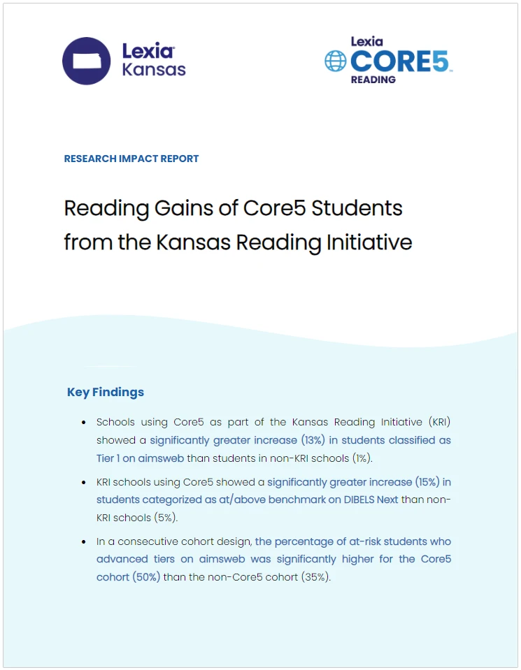 PURPOSE: To support students in Kansas schools, state legislators passed the Kansas Reading Initiative (KRI). The initiative consisted of a two-year pilot program (2013-2014, 2014-2015) designed to improve reading outcomes for students in Kansas using educational technology—specifically, Lexia® Core5® Reading. Analyses were conducted to assess the effectiveness of Core5 in Kansas schools.